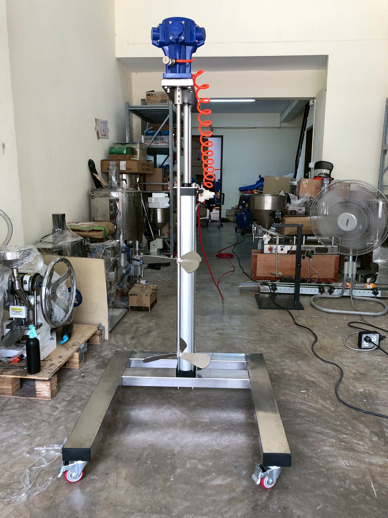เครื่องผสมกวนแบบใช้ปั้มลม แบบแรงขับเคลื่อนทำให้ใบกวนหมุน โดย Sp-100g-A ออกแบบให้ใช้งานง่าย โดยมีโครงสร้างที่แข็งแรง มีล้อในตัวเคลื่อนย้ายแบบรถเข็น มีกระบอกลมยกขึ้นยกลง สะดวกในการใข้งานสุดๆ