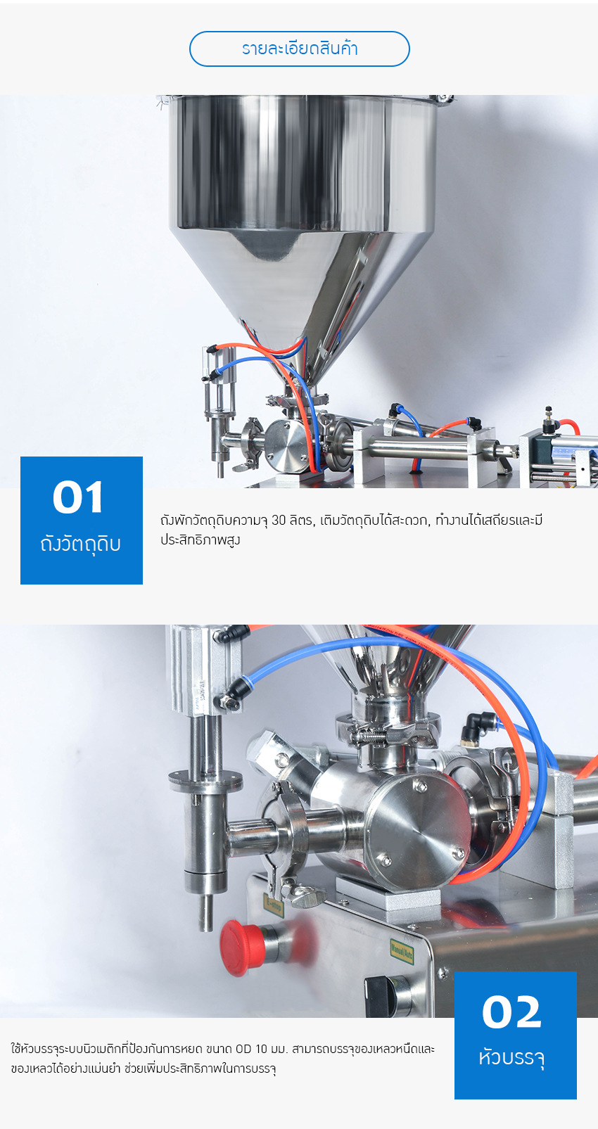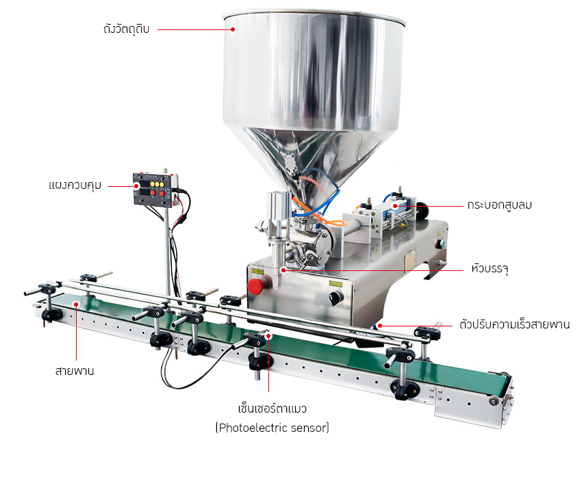 - แม่นยำสูง: ระบบการบรรจุแบบลูกสูบ (Piston) ควบคุมปริมาตรการบรรจุได้อย่างแม่นยำ ทำให้สินค้าทุกขวดมีมาตรฐานเดียวกัน