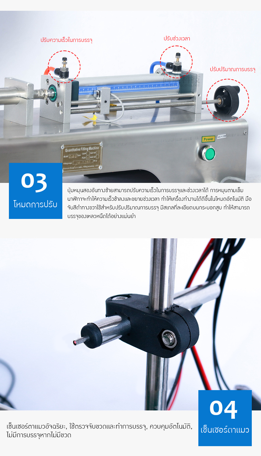- กำลังการผลิต: 15-60 ขวด/นาที (ขึ้นอยู่กับปริมาตรบรรจุ)